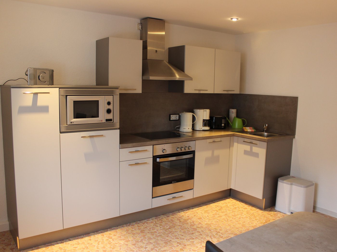 Küche: Einbauküche mit 4-Zonen Cerankochfeld, Backofen, Geschirrspüler, Kaffeemaschine, Kühlschrank mit Gefrierfach, Mikrowelle, Toaster, Wasserkocher, Geschirr