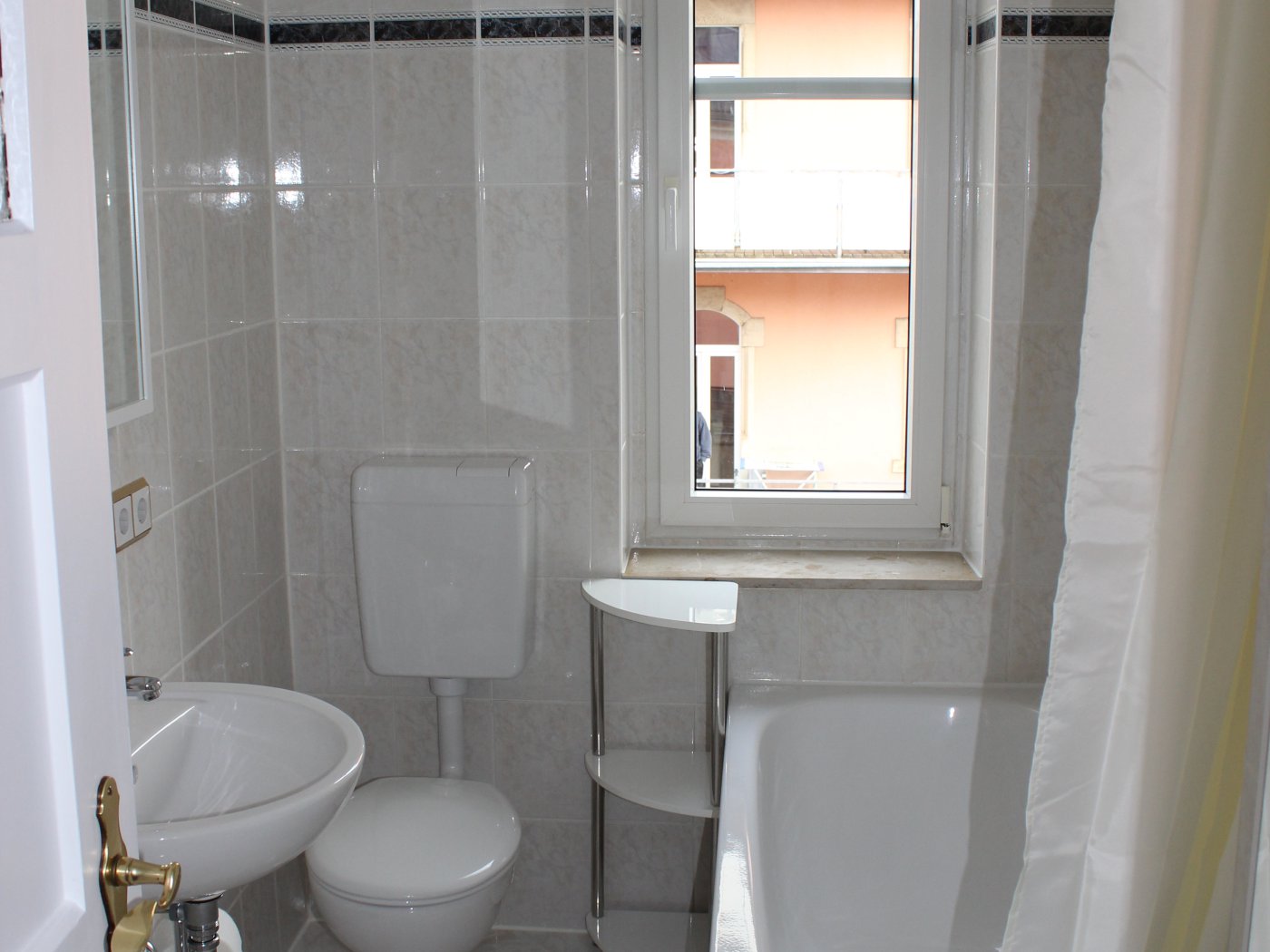 Bad: mit Badewanne und Duschmöglichkeit, Waschbecken, WC, Haartrockner