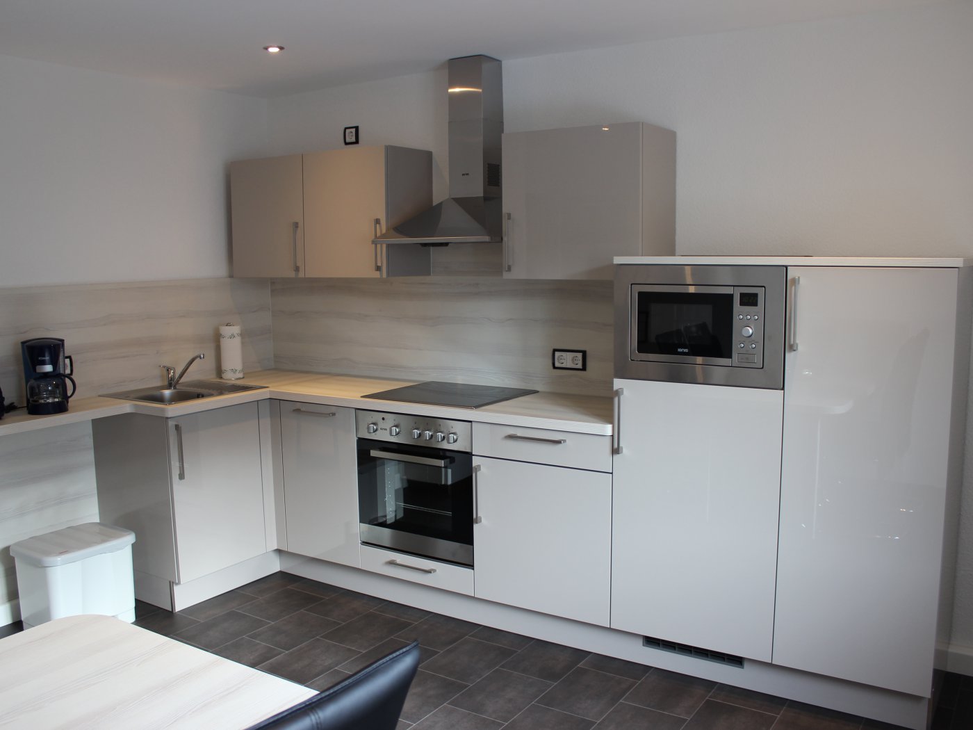 Küche: Einbauküche mit 4-Zonen Cerankochfeld, Backofen, Geschirrspüler, Kaffeemaschine, Kühlschrank mit Gefrierfach, Mikrowelle, Toaster, Wasserkocher, Geschirr